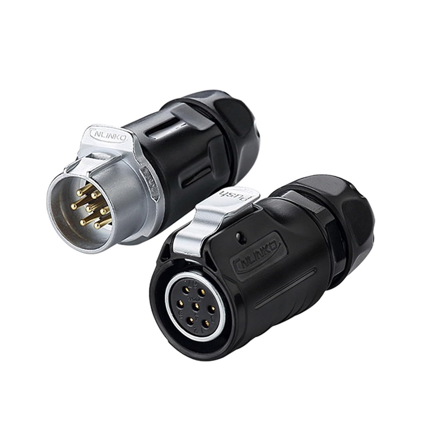Electrical ConnectorLP20 IP68 Waterproof Electrical Connector Solder Cable Multi Pin High Current Quick Connect for Industrial & AutomotiveFeaturesQuick Connect Feature The quick connect feature allows for swift and easy connections enhancing efficiency and productivityHigh Current CapabilityDesigned for high current applications this connector can handle demanding industrial and automotive needsMulti-Pin ConfigurationWith its multi-pin design, this connector offers versatile connectivity options for various devices and systems.IP68 WaterproofThe LP20 connector ensures optimal performance in harsh environments with its IP68 waterproof rating.==========Hign-concerned Chemical : NoneModel Number : LP-20Cable Specification(2~4pin) : 2.5~4.0mm²/14-12AWGDiameter Range(2~7pin) : 10.0-12mmRated Current : 5A~20AOperating Voltage(AC.V.rms)1 Minute : 250V~500VContact Resistance(Max.) : 1-5m OmegaInsulation Resistance(Min.) : 500M OmegaProtection Level : IP68Working Temperature : -25~+85 Degree CentigredeConnecting Mode : Screw ConnectorSoldering : Easy Locking TypeCable Specification(5~7pin) : 1.0~1.5mm²/18-16AWGCable Specification(9~12pin) : 0.34~0.5mm²/22-20AWGDiameter Range(9~12pin) : 5.0-6.5mmConnector type : Inline connector