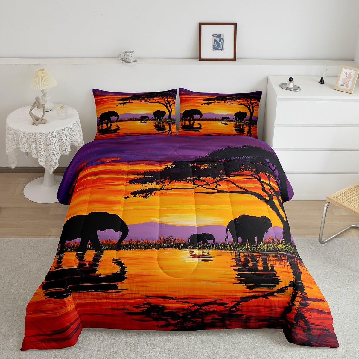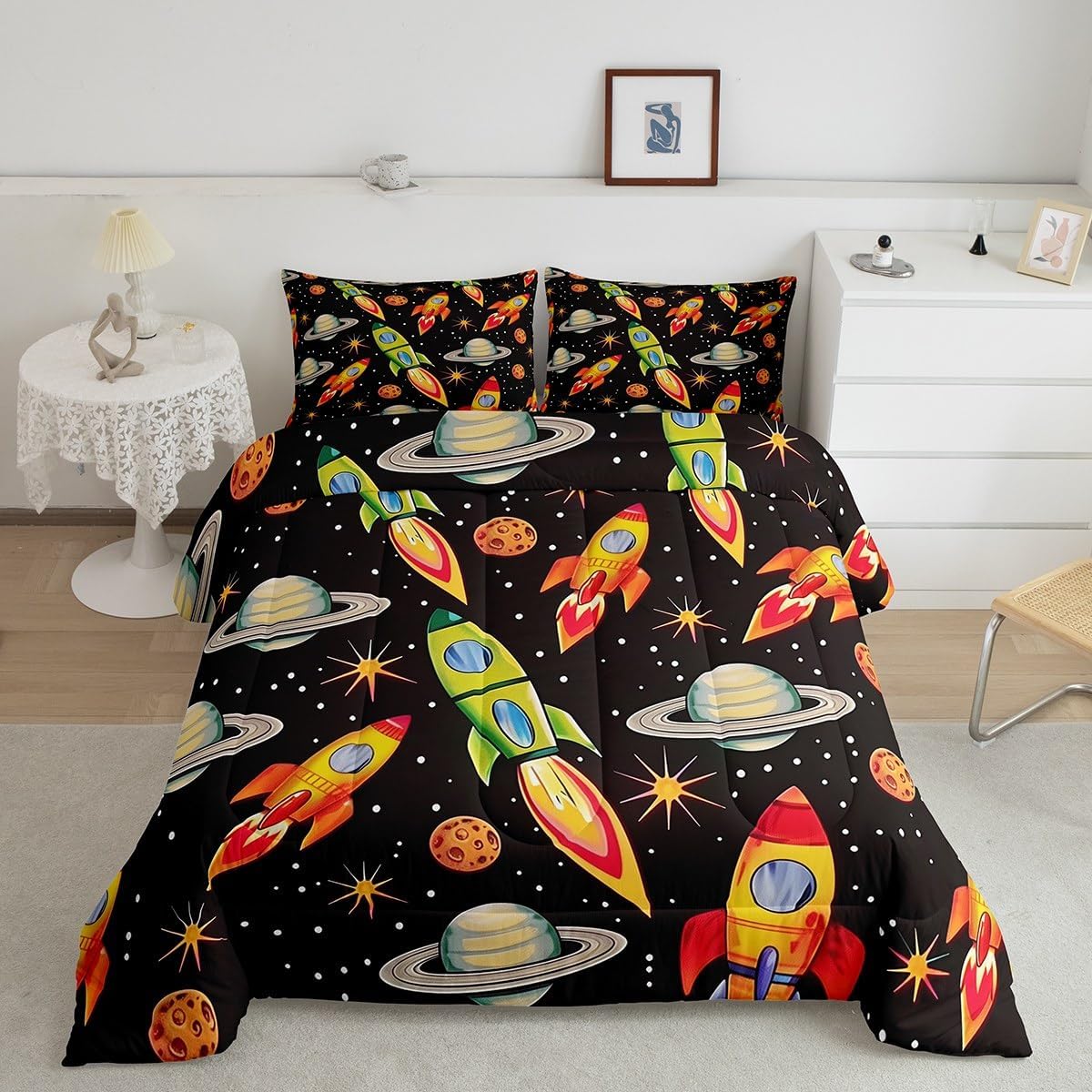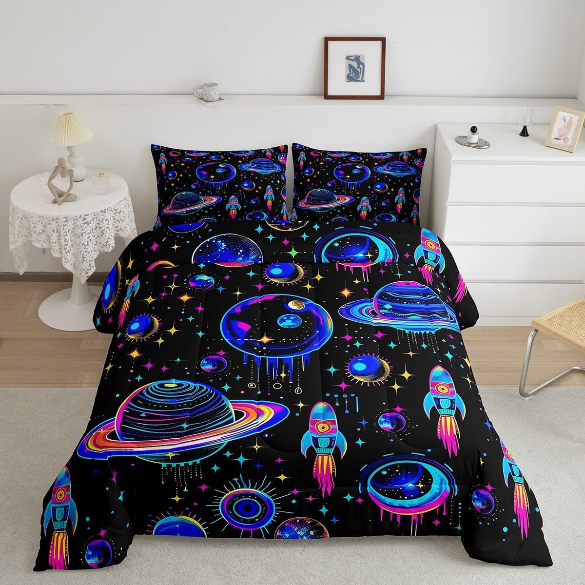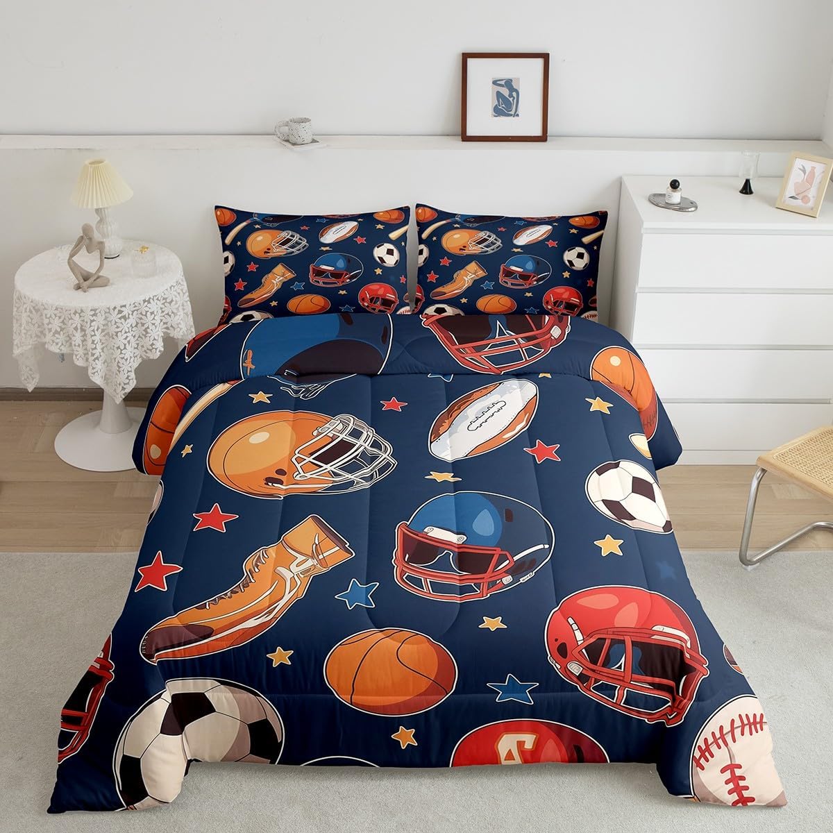 Makeover your bedrooms every season with our comforter sets; good item for your room, girls boys youth room, master bedroom Also a great decoration idea for your mom, dad, sister, brother, grandma, wife, husband, daughter, son and all other beloved Size Information:1 Toddler size comforter 42" X 58" and 1 pillowcase 30" X 20"1 Twin size comforter 68" X 90" and 1 pillowcase 30" X 20"1 Full size comforter 79" X 91" and 2 pillowcases 30" X 20"1 Queen size comforter 90" X 90" and 2 pillowcases 30" X 20"1 King size comforter 104" X 90" and 2 pillowcases 36" X 20"Useful and practical: A practical product for homes, dorm rooms, hotels, guest rooms. Comfortable to use for being polyester which is soft and breathable Unique design:Vivid colors and clear printed with digital printing. These unique designs match well with various color of your rugs, curtains, headboard, furniture, and all other decor accessories Characteristic:As manufacturers of digital printed home textiles, we follow current trends and bring you new home fashion Either a comforter to your family or friend, relative or boyfriend girlfriend, or to yourself, the item should be interesting and authentic Note:The comforter and pillow cases are printed on the front side only, the back of them are white colored