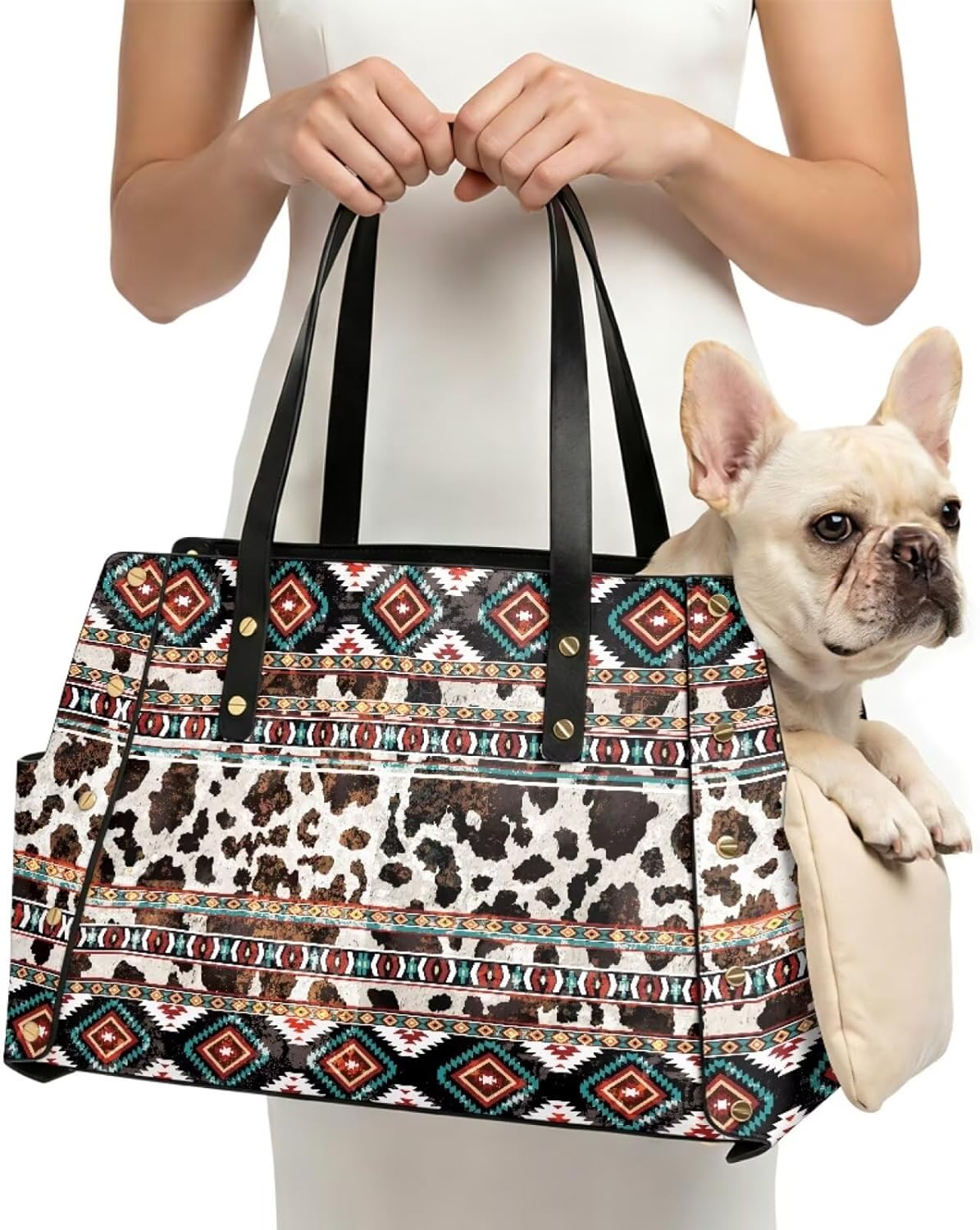 1. Product Description: This product is a soft-sided pet carriers designed for small dogs, cats, and other small animals. It features a handbag-style exterior for stylish and convenient pet transport. 2. Material: The dog purse carrier is constructed from PU leather (synthetic leather), which is designed to be waterproof, wear-resistant, and resistant to fading. The material is easy to clean with a damp cloth. Key stress points, including handle attachments and corners, are reinforced with metal rivets to increase load-bearing capacity and ensure long-lasting structural integrity during travel. 3. Dimensions: The dog travel bag measures 40 centimeters in length, 17 centimeters in width, and 24 centimeters in height. These dimensions provide ample interior space for small to medium-sized pets such as cats, small dogs, and similar animals. The open-top design of small dog purse allows pets to look out and observe their surroundings, which may help reduce travel anxiety. 4. Design Features: Removable Cushion: The pet travel bag includes a soft, plush interior cushion that provides a comfortable resting surface for pets. The cushion is removable and machine washable, allowing for regular cleaning and maintenance of a hygienic interior environment. Carrying Handles: Cat carrying bag equipped with two ergonomic black leather handles designed for comfortable hand carry. The handles are positioned to provide balanced weight distribution, reducing strain during prolonged carrying periods. Assembly: The product ships in a flat, compact package for reduced shipping volume. Assembly can be completed in a few simple steps without the need for tools, and the pet purse is ready for use within minutes. Exterior Finish: The dog carry bag maintains a sleek, structured shape due to the quality of the PU leather and construction. Multiple patterns and color options are available.