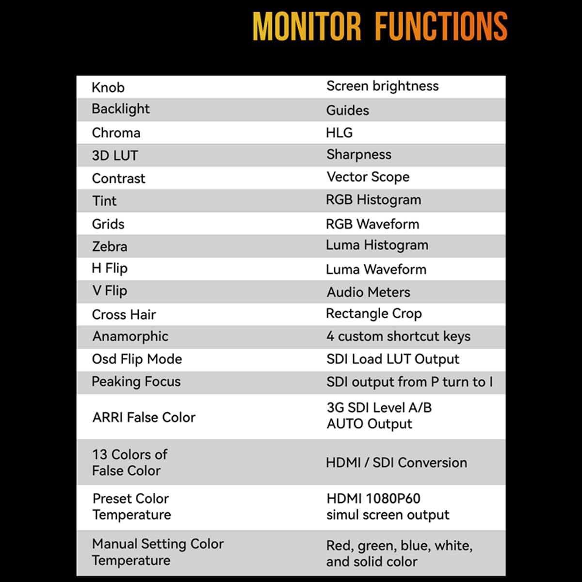 The Portkeys HS8 also allows you to make crucial decisions on set and have confidence in your image with a full suite of monitoring tools, including: 3D LUT monitoring with 3D LUT SDI output capabilities. Custom LUTs can be loaded via the USB-A port at the bottom of the monitor. RGB and Luma Waveform/Histogram exposure tools. There is also an adjustable Zebra tool. Customizable False Color with 13 different colors, including ARRI False Color. Anamorphic image de-squeeze with all the standard ratios (1.33x, 1.5x, 2.0x) and the possibility to enter a custom aspect ratio from 0.25 to 4.0x. Peaking and Zoom functions to nail focus easily. 3G SDI Level A/B auto output and SDI transform from Progressive to Interlaced capabilities. Framing tools: crosshair, check field, guides, grids, rectangle crop. Audio meters. Monitor adjustments: black level, backlight, contrast, color temperature, sharpness, chroma, brightness, tint, HDR HLG, OSD Flip mode. The Portkeys HS8 ships with a D-Tap to locking 5.5mm power cable, a screen cleaning wipe, a USB key, a set of M3 Allen screws, an Allen key, and replacement cup head gaskets for the protection screen.